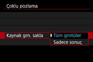 [Kaynak grn. sakla: Tüm grntüler] seçeneği, o zamana kadar çekilmiş olan tüm tekli pozları ve oluşturulan çoklu pozları kaydeder ve çoklu poz çekiminden çıkar. [Kaynak grn. sakla: Sadece sonuç] seçeneği, sadece o zamana kadar oluşturulan çoklu pozları kaydeder ve çoklu poz çekiminden çıkar. |