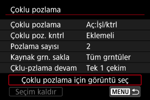 [Çoklu pozlama için görüntü seç] ile karta kayıtlı görüntülerden birini ilk tekil poz olarak seçebilirsiniz (). Kartta kayıtlı çoklu görüntü kayıtlarını birleştiremezsiniz.
