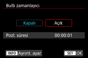 - Çekim modunu değiştirdiğinizde bulb zamanlayıcı silinir (ve [Kapalı] ayarına geri döner).