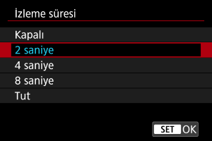 Çekimden hemen sonra çekimin görüntülenmeye devam etmesi için [Tut] ayarı yapın ve çekimin görüntülenmesini istemiyorsanız [Kapalı] ayarı yapın.