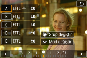 Kablosuz çoklu flaşlı fotoğrafçılıkta çekim ekranını görüntülerken, [: Çkm için dğmlri özellştirin] içinde [Hızlı flaş grup kontrolü] işlevine atanan tuşa basarak her flaş grubu için ayarları yapılandırabilirsiniz. Bu örnek,