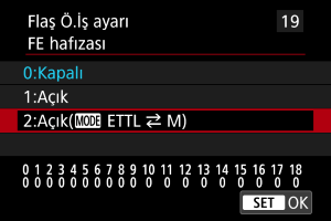 : Harici Speedlite kontrolü] () seçeneği altında [Flaş işlevi ayarları] içinde de ayarlayabilirsiniz.