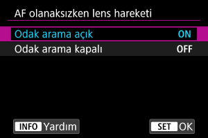 - [Odak arama kapalı] ayarı, lens fazlasıyla odak dışı kalırsa, odak aramasında önemli oranda gecikme olmasını önlemek amacıyla geniş bir odaklanma alanını kaplayan süper telefoto lensler ve diğer lensler için önerilir.