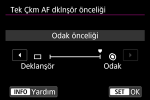 Tek Çekim AF’de odaklanmaya veya deklanşör bırakma zamanlamasına öncelik tanınmasını sağlayabilirsiniz (Dokunmatik Deklanşör ile çekim hariç).