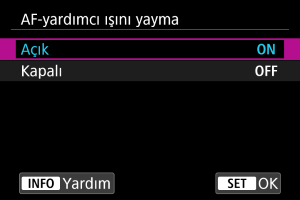 Fotoğraf makinesi AF yardımcı ışığı yakacak ya da kapatacak veya EOS fotoğraf makineleri için bir Speedlite'ı etkinleştirecek veya kapatacak şekilde ayar yapabilirsiniz.
