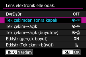 : Lens elektronik elle odak.] ayarı [Kapalı] dışındaki bir seçeneğe getirildiğinde, [Elektronik her an elle odak.] ve [