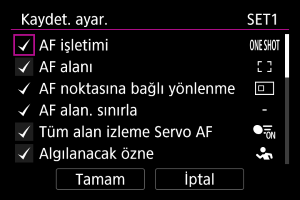 Kaydedilecek AF ayarlarını seçin.