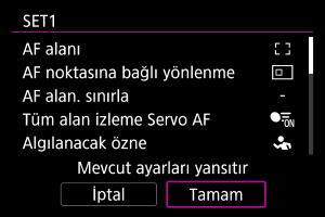 ] onay işareti ekleyin. [Tamam]’ı seçerek ayarı kaydedin. AF alanlarıyla ilgili ayrıntılar için AF Alanı konusuna bakın.