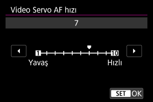 Video Servo AF için AF hızını ayarlayabilirsiniz. Bu işlev, video kaydı sırasında yavaş odak geçişiyle uyumlu lensler kullanırken [: Video Servo AF] içindeki [Video Servo AF] [Açık] olarak ayarlandığında etkinleştirilir.*