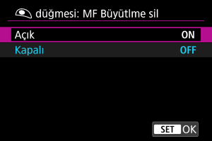 Bu özelliği [Açık] olarak ayarladığınızda, MF odak modunda fotoğraf çekerken deklanşör düğmesine yarım basarak büyütülmüş görünümü iptal edebilirsiniz.