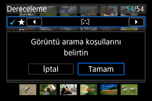Görüntü gösterimini arama koşullarına göre filtreleyebilirsiniz. Görüntü arama koşullarını ayarladıktan sonra, sadece bulunan görüntüleri oynatabilir ve görüntüleyebilirsiniz. Filtrelenen görüntülere koruma, derecelendirme, silme, slayt gösterisi oynatma işlemi ve diğer işlemleri de uygulayabilirsiniz.