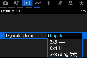Fotoğraflar üzerinde oynatma ekranında tek tek görüntülenirken bir kılavuz görüntüleyebilirsiniz. Bu işlev, görüntülerdeki yatay/dikey eğikliği ve kompozisyonu kontrol etmek için kullanışlıdır.