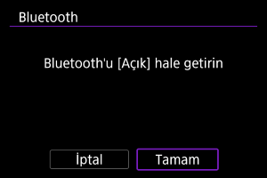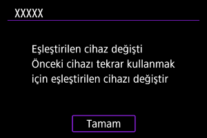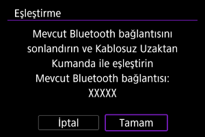 - Fotoğraf makinesi zaten başka bir cihazla eşleştirilmişse bir mesaj görüntülenir. Mevcut Bluetooth bağlantısını sonlandırmak için [Tamam]’ı seçin.