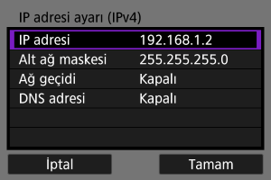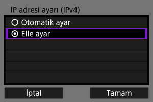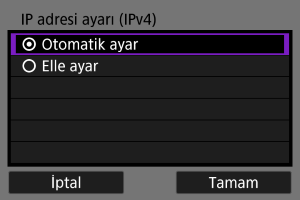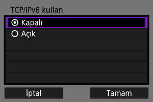 Bir IP adresi ayar yöntemi seçin ve sonra makinede IP adresini ayarlayın. IPv6 kullanıldığında fotoğraf makinesi sadece IPv6 aracılığı ile bağlanır. IPv4 bağlantıları devre dışı bırakılır.