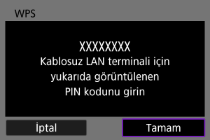 Bu, WPS ile uyumlu erişim noktalarıyla kullanılan bir bağlantı yöntemidir. PIN kodu bağlantı modunda (PIN modu), bir bağlantı kurmak için fotoğraf makinesinde belirlenen 8 basamaklı bir kimlik numarası, erişim noktasına girilir.