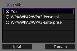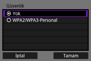 - Aynı güvenlik türü hem diğer cihazda hem de fotoğraf makinesinde ayarlanmalıdır. Kimlik doğrulama ve şifreleme tipleri hakkında daha fazla bilgi edinmek için Kimlik doğrulama ve veri şifreleme yöntemleri konusuna bakın.