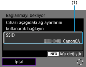 - (2) içindeki boş alan, aynı ada sahip birden fazla SSID algılandığını gösterir. (2)’si boş olan bir SSID’nin seçilmesi, fotoğraf makinesinin bunlar arasından en güçlü sinyale sahip erişim noktasına bağlanmasını sağlar.