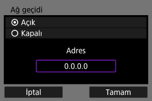 Bir ağ geçidi kullanmak için [Açık] seçimi yapın, sonra [Adres] seçimi yapın.
