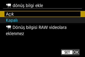 : Vid. kayıt formatı] seçeneği [RAW] olarak ayarlandığında video yönlendirme bilgisi eklenmez.