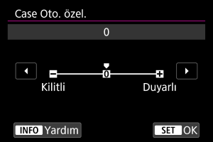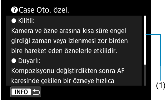 [INFO Yardım] görüntülendiğinde INFO tuşuna basarak özellik hakkında bir açıklama görüntüleyebilirsiniz. Yardım ekranından çıkmak için tuşa tekrar basın. Sağda bir kaydırma çubuğu (1) görüntülendiğinde ekranda kaydırmak için Hızlı kontrol kadranı 1 kadranını çevirin.