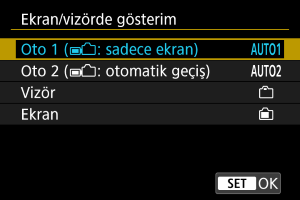 Ekran açık olduğunda vizör sensörünün yanlışlıkla aktifleşmesini önlemek için gösterim için ekranı veya vizörü kullanabilirsiniz.