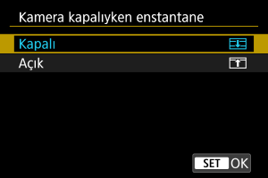 Fotoğraf makinesinin güç düğmesi konumundayken perdeyi açık veya kapalı tutacak şekilde ayar yapabilirsiniz.