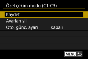 Özel çekim modunda çekim yaparken bir ayarı değiştirirseniz, mod otomatik olarak yeni ayar ile güncellenebilir (Otomatik güncelleme). Bu otomatik güncellemeyi etkinleştirmek için 2. adımda [Otomatik güncelleme ayarı] seçeneğini [Açık] olarak ayarlayın.