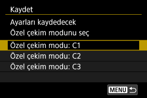 - Kaydedilecek Özel çekim modunu seçin, sonra [Ayarları kaydet] ekranında [Tamam]’ı seçin.