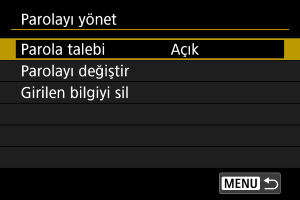 Güç düğmesi konumuna getirildiğinde veya makine otomatik kapanma modundan çıktıktan sonra girilen parolayı yönetmek için bu ayarları kullanın. Fotoğraf makinesinin başlatılması sırasında gerekli olan parolayı ayarlama talimatları için, Parola Ayarlama konusuna bakın.