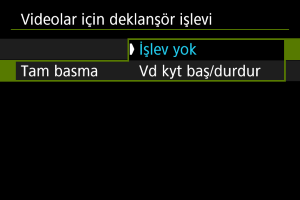 [Tam basma] ayarı [Vd kyt baş/durdur] konumuna ayarlandığında video çekimini sadece video çekim tuşu ile değil, deklanşör tuşuna tam basarak veya bir uzaktan kumanda düğmesi (ayrı satılır) kullanarak da başlatıp durdurabilirsiniz.
