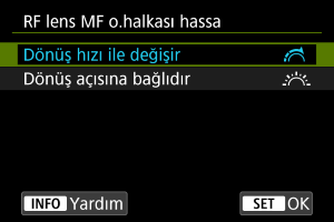 - Bu menü, odak/kontrol halkası düğmesi bulunan lenslerde görüntülenmez. Odak/kontrol halkası işlevini yapılandırmak için lensi kullanın.
