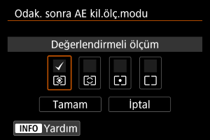Her ölçüm modu için konular Tek Çekim AF ile odağa alındığında pozun (AE kilidi) kilitlenmesini sağlayabilirsiniz. Deklanşör tuşu yarım basılı tutulurken poz kilitlenir. AE kilidi için ölçüm modlarını seçin ve bir [] onay işareti koyun. [Tamam]’ı seçerek ayarı kaydedin.