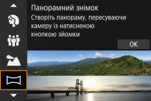 Для зйомки панорамних знімків використовуйте [] (Панорамний знімок). Панорама створюється шляхом поєднання знімків, зроблених під час безперервної зйомки, коли ви рухаєте камеру в одному напрямку, повністю натискаючи кнопку затвора.