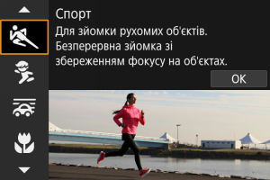 Для зйомки рухомого об’єкта, наприклад людини, що біжить, чи автомобіля, що їде, використовуйте режим [] (Спорт).