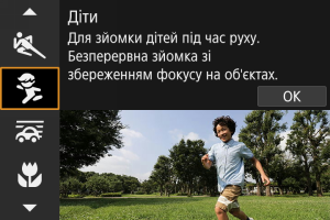 Використовуйте режим [] (Діти), щоб знімати активних дітей, які рухаються. Шкіра матиме природні відтінки.