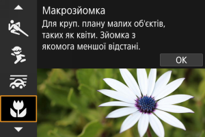 Використовуйте режим [] (Макрозйомка) для великих планів маленьких об’єктів, наприклад квітів. Щоб отримати збільшене зображення маленьких предметів, використовуйте макрооб’єктив (продається окремо).