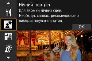 Використовуйте режим [] (Нічний портрет) для яскравих, красивих знімків людей на фоні нічних сцен. Зверніть увагу, що під час зйомки в цьому режимі необхідно застосовувати пристрій зовнішнього спалаху. Рекомендується використовувати штатив.