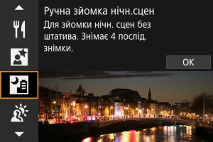 [] режим (Ручна зйомка нічн.сцен) дає змогу знімати з рук нічні сцени. У цьому режимі зйомки камера робить чотири знімки одного сюжету поспіль, усуває наслідки тремтіння та записує в пам’ять остаточне зображення.
