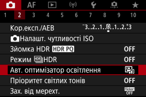 - Якщо вибрано будь-яке значення, окрім [Вимк.], і, з метою отримання темнішого кадру, використовується корекція експозиції або корекція експозиції для зйомки зі спалахом, зображення все одно може вийти надто яскравим. Якщо потрібно зробити його темнішим, вимкніть цю функцію, вибравши значення [Вимк.]