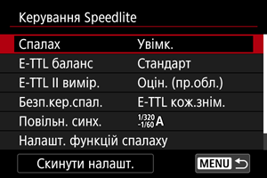 Функції спалахів Speedlite серій EL/EX, що сумісні з параметрами функцій спалаху, можна налаштовувати за допомогою екрана меню камери. Перед налаштуванням функцій спалаху зовнішній спалах Speedlite слід приєднати до камери й увімкнути.