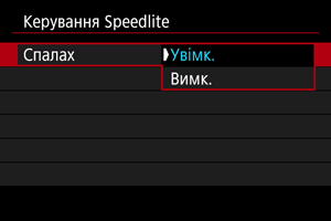 Щоб здійснювати зйомку зі спалахом, установіть значення [Увімк.]. Якщо вибрати значення [Вимк.], працюватиме лише лампа підсвічування АФ Speedlite.