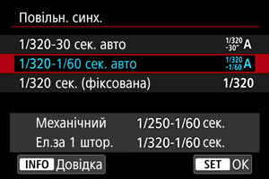 : Режим затвору]. Вона становить 1/320 с, якщо вибрано [Ел.за 1 штор.], і 1/250 с, якщо вибрано [Механічний].