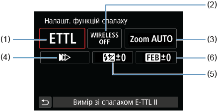 Інформація, що відображається на екрані, розташування дисплея та доступні параметри залежать від моделі зовнішнього спалаху Speedlite, налаштувань його користувацьких функцій, режиму спалаху й інших факторів. Докладніше про функції спалаху Speedlite див. в інструкції з використання спалаху Speedlite.