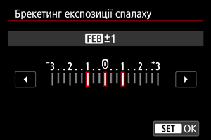 Для спалахів Speedlite з брекетингом експозиції спалаху (FEB) потужність спалаху може змінюватись автоматично за зйомки трьох послідовних кадрів.