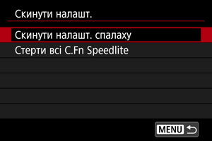 - Виберіть [Скинути налашт. спалаху] або [Стерти всі C.Fn Speedlite].