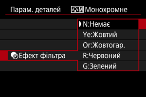 | N:Немає | Звичайне чорно-біле зображення без ефекту фільтра. |