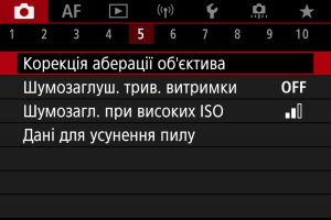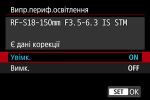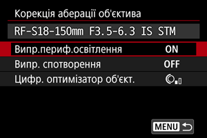 - Якщо використовується об’єктив іншого виробника (не Canon), для функцій корекції рекомендується встановлювати значення [Вимк.], навіть коли відображається повідомлення [Є дані корекції].