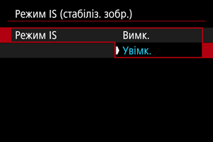 - Виберіть [Увімк.], щоб використовувати режим IS на камері.