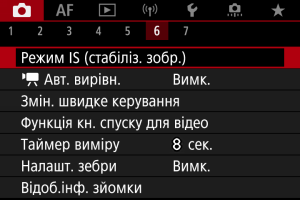 - Докладніше про настроювання стабілізації зображення для фотозйомки див. в розділі Image Stabilizer (Стабілізатор зображення) (режим IS).