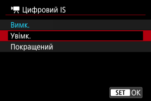 Цифровий IS] значення [Увімк.] або [Покращений] також передбачає встановлення для параметра [Режим IS] значення [Увімк.].